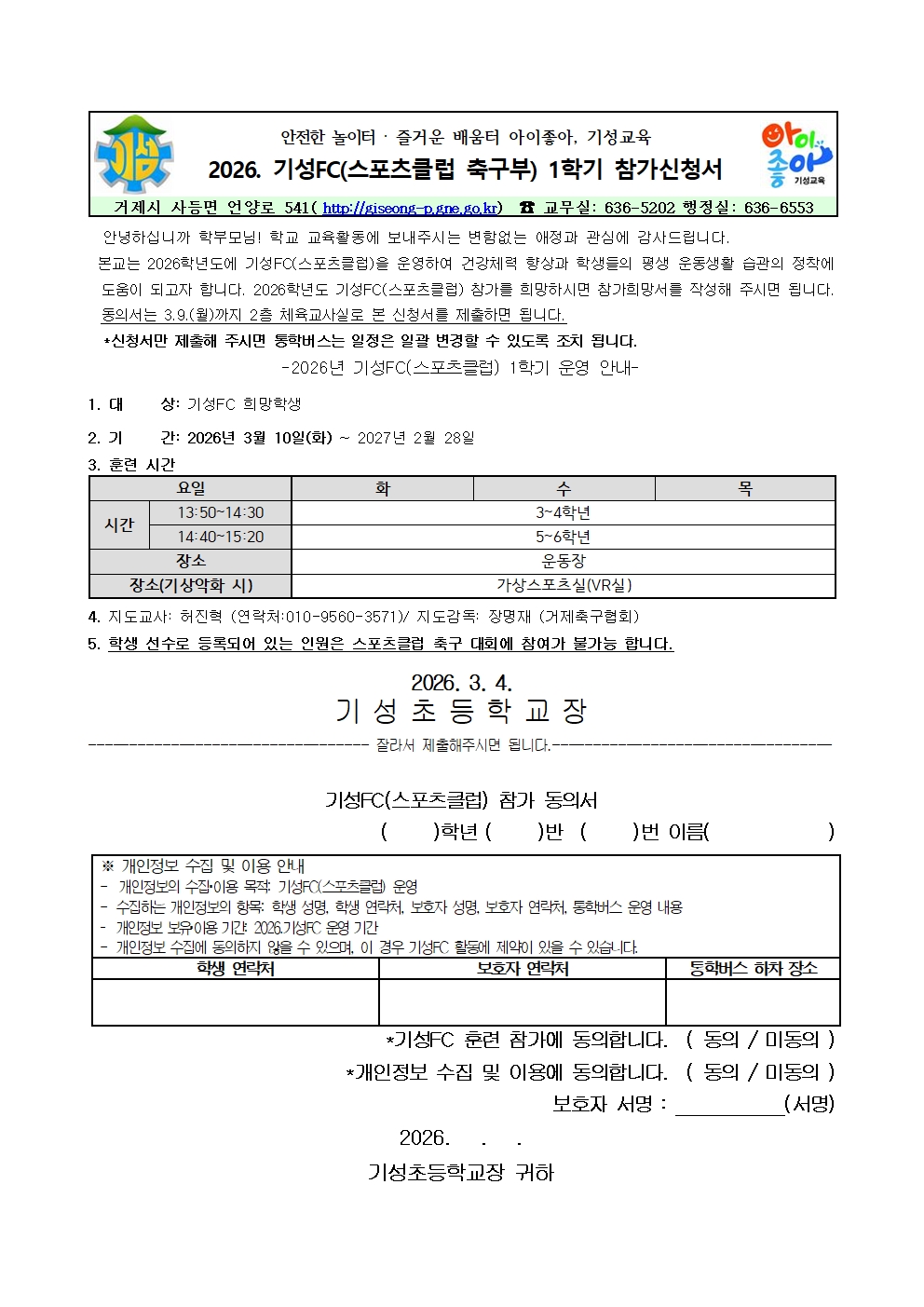 2026. 기성FC(스포츠클럽 축구부) 1학기 참가 신청서 (3~6학년 대상)