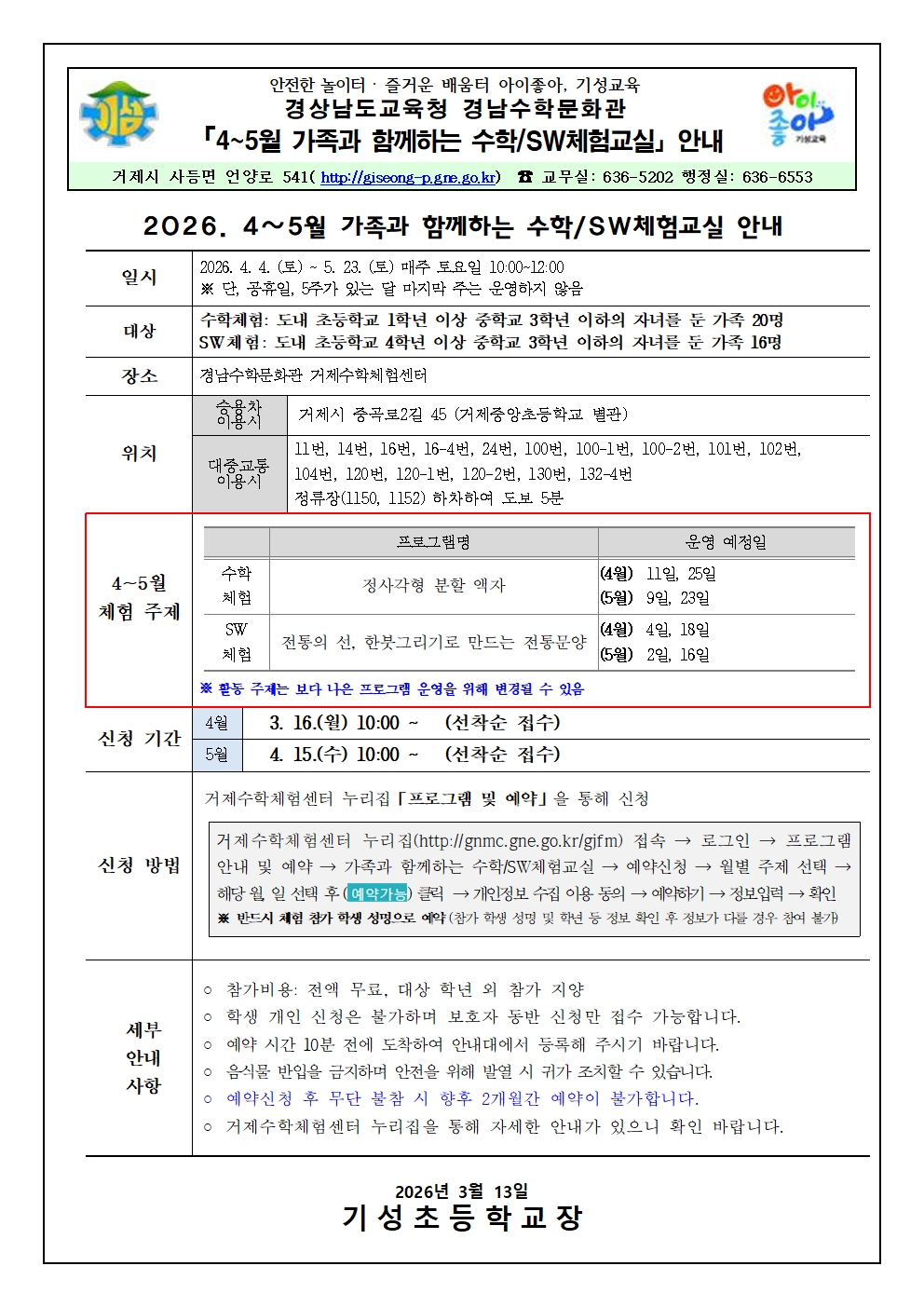 2026. 거제수학체험센터 4~5월 가족과 함께하는 수학SW체험교실 안내 가정통신문.hwp