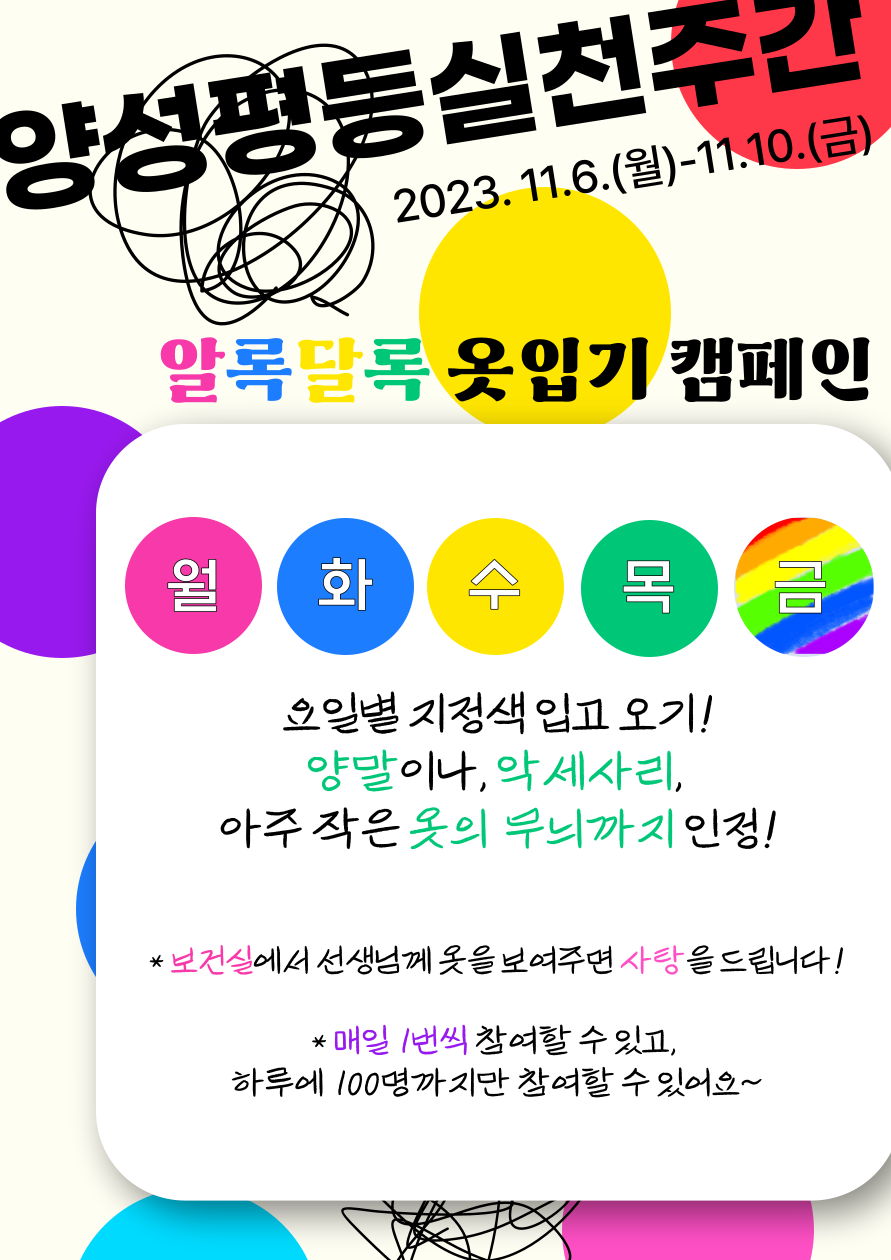 양성평등 실천주간을 맞이하여 보건실에서 양성평등 알록달록 옷입기 캠페인을 진행하오니