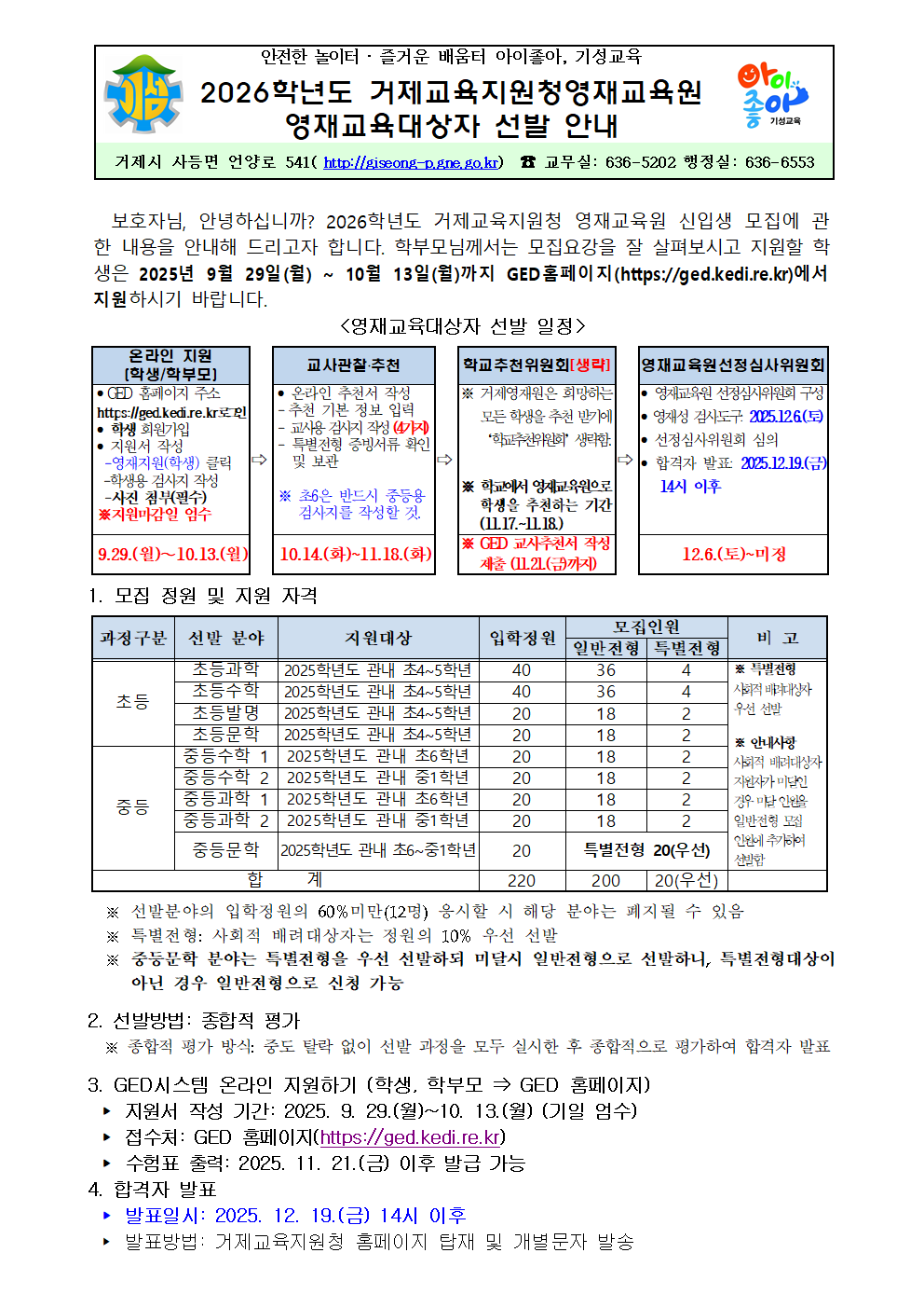 2026학년도 거제교육지원청영재교육원 영재교육대상자 선발 안내